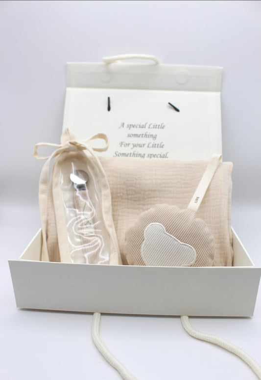 Baby Boy Gift Box Muslin Blanket ,corduroy pacifier clip and plushie