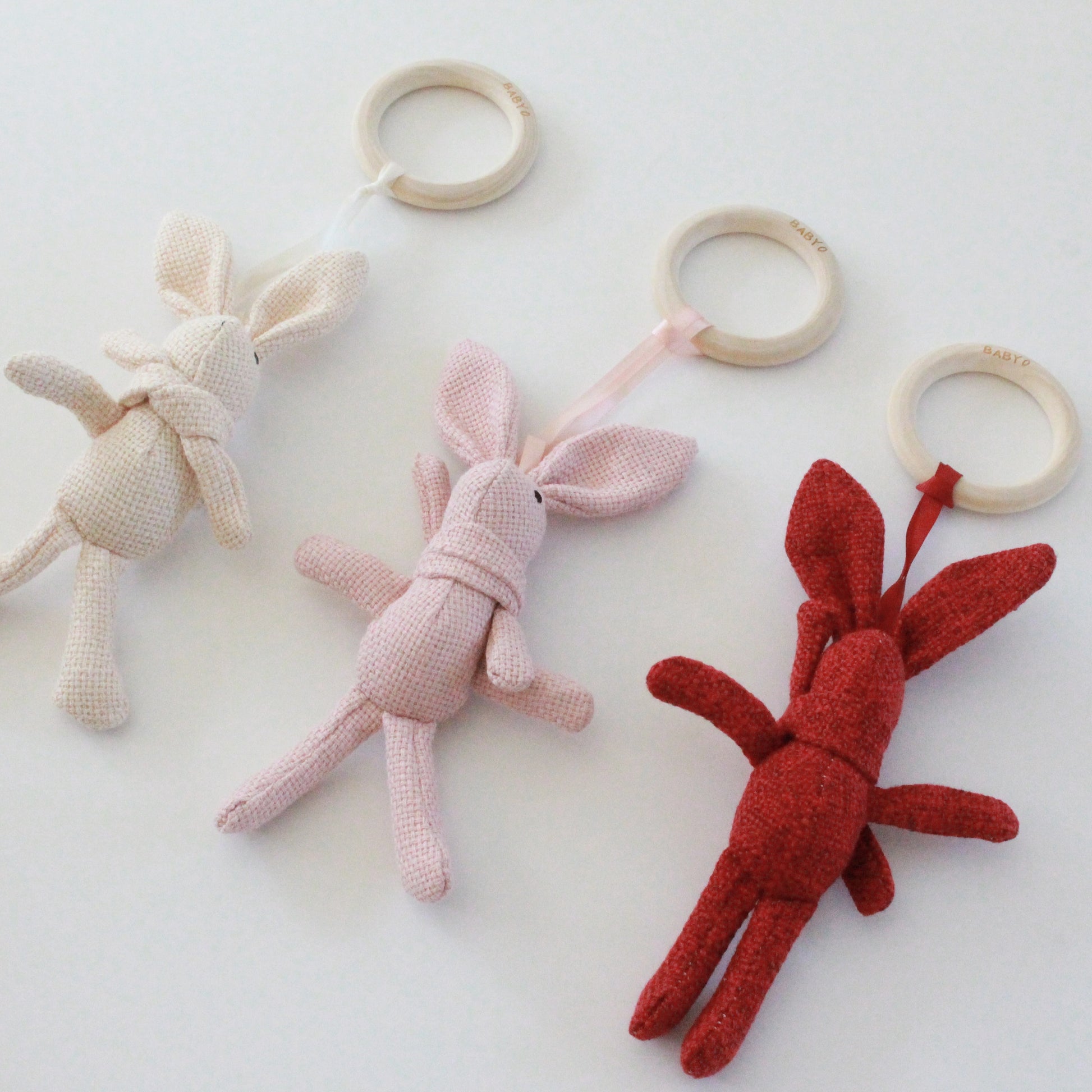 Adorable bunny accompanied by a wooden teether.